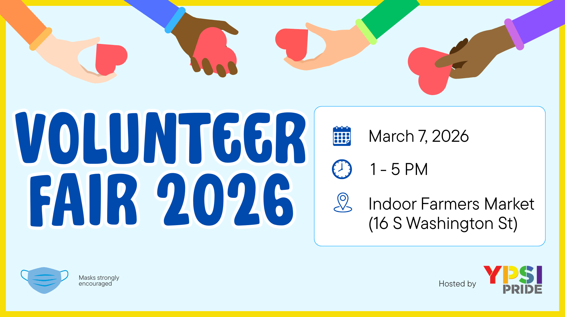 2026 Volunteer Fair (March 7): Want to get involved in the community? Ypsi Pride is bringing together nonprofits and local groups for a volunteer fair where you can learn more about what they do and sign up to get involved with their great work! Come check it out Saturday, March 7, from 1-5 PM at the Indoor Farmers Market on 16 S Washington. More details about all the amazing organizations who will be in attendance coming soon!